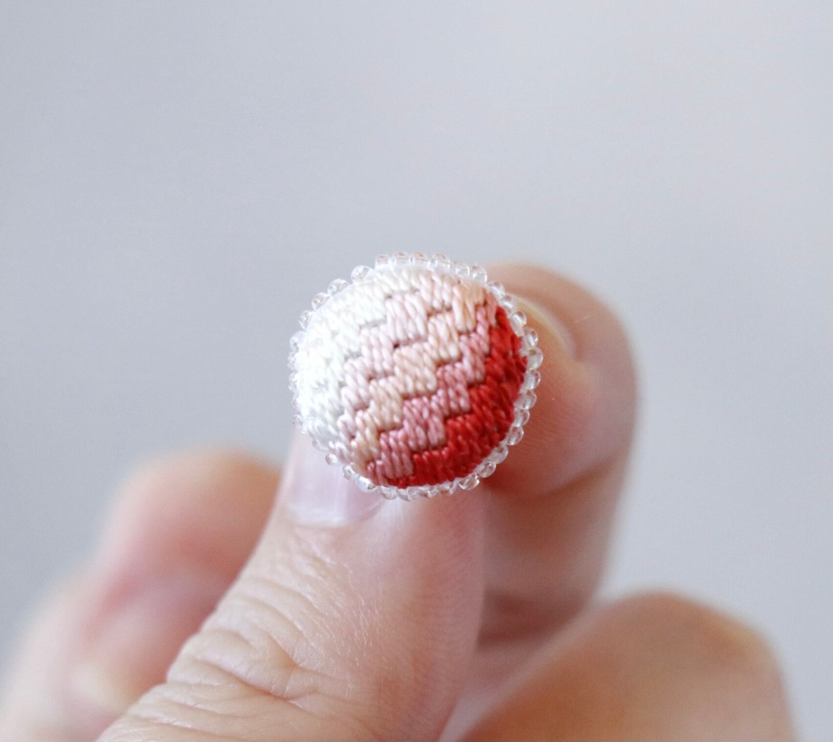 淡いピンクから赤へと移ろう色糸で、やわらかなグラデーションを表現しました。